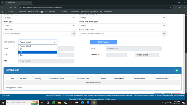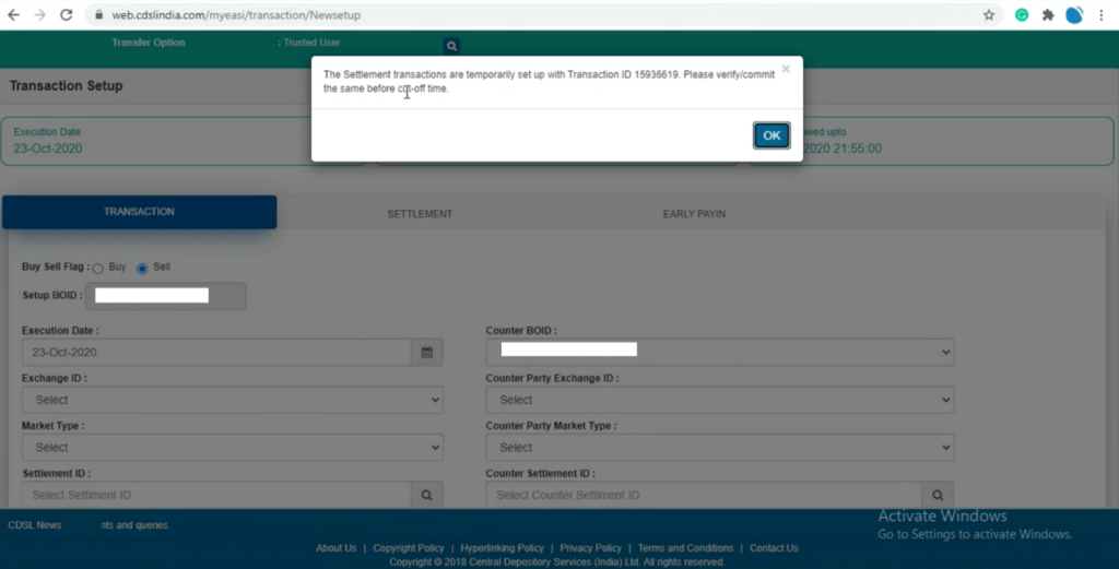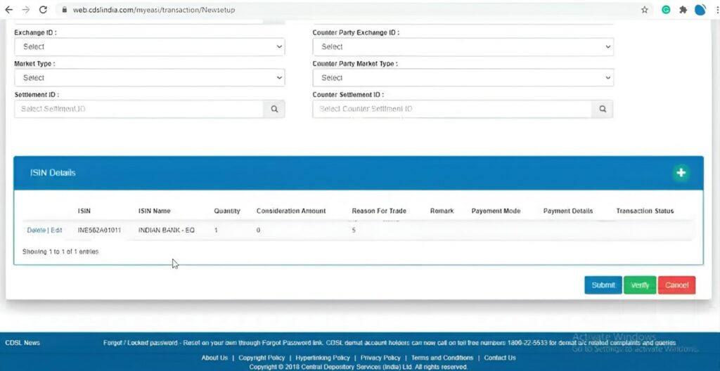 6. Click on Verify. Exchange ID, Counter Party Exchange ID, Market Type, Counter Party Market Type, Settlement ID and Counter Settlement ID need not be filled in for off-market transactions.